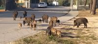 Un gat creua el carrer sense cap mena de perill, mentre els gossos borden, no massa a prop, probablement a algun porc senglar que s'allunya de les proximitats.